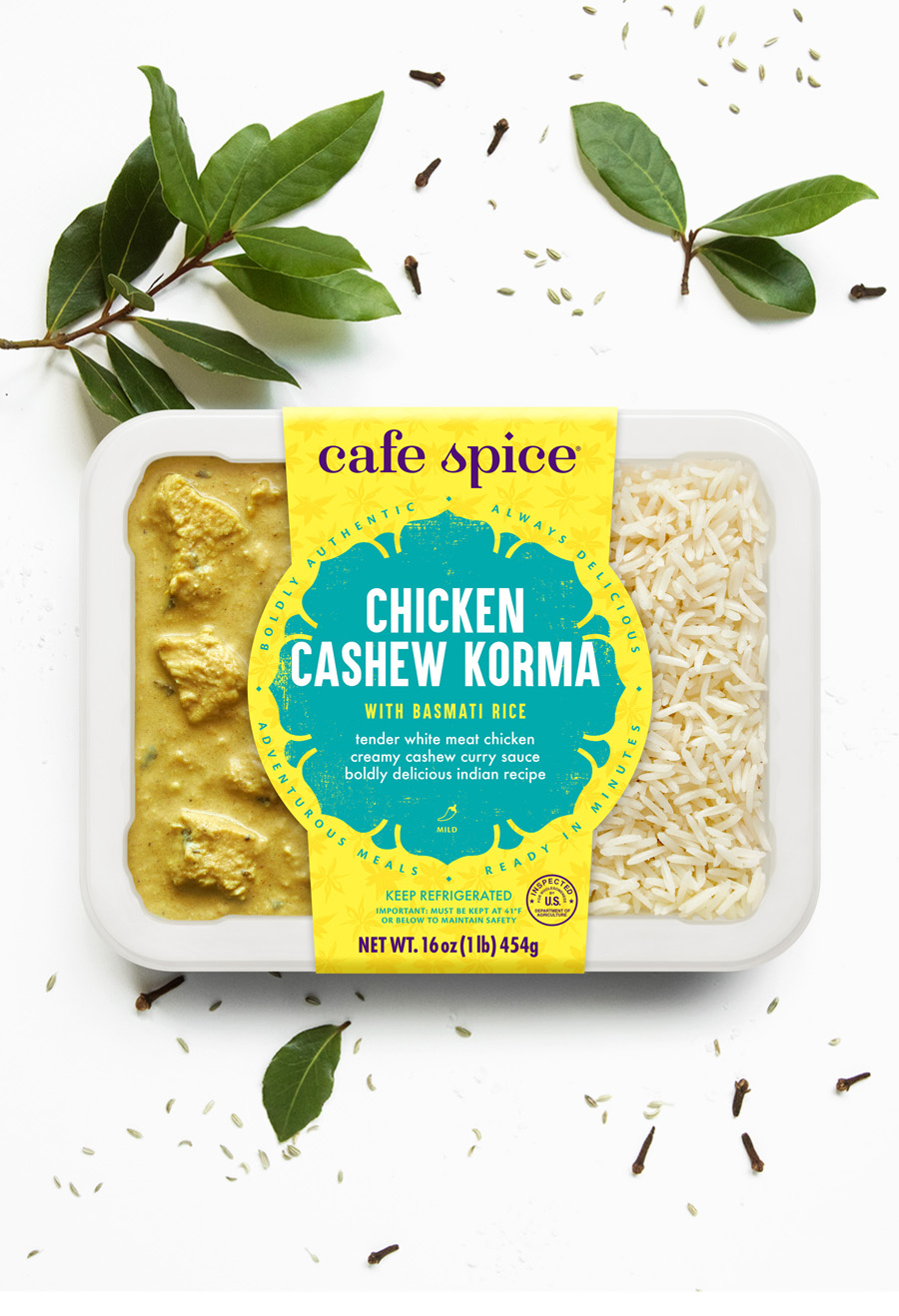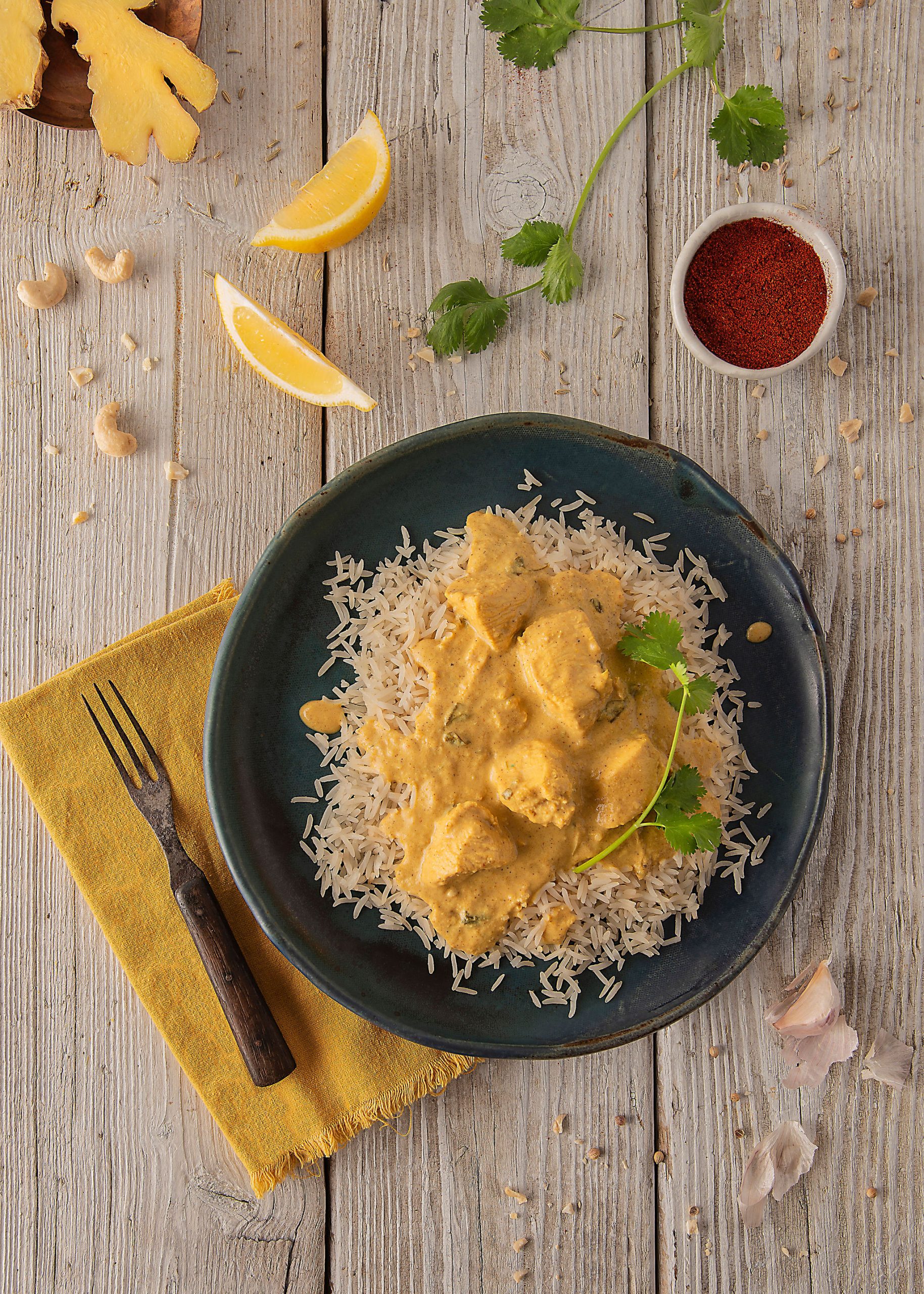 Inspired by the coastal regions of India, our Chicken Cashew Korma is a perfect balance of flavors. Tender pieces of white meat chicken are simmered in a bright and creamy cashew curry sauce. We pair this Chef-crafted dish with delicate Basmati rice.