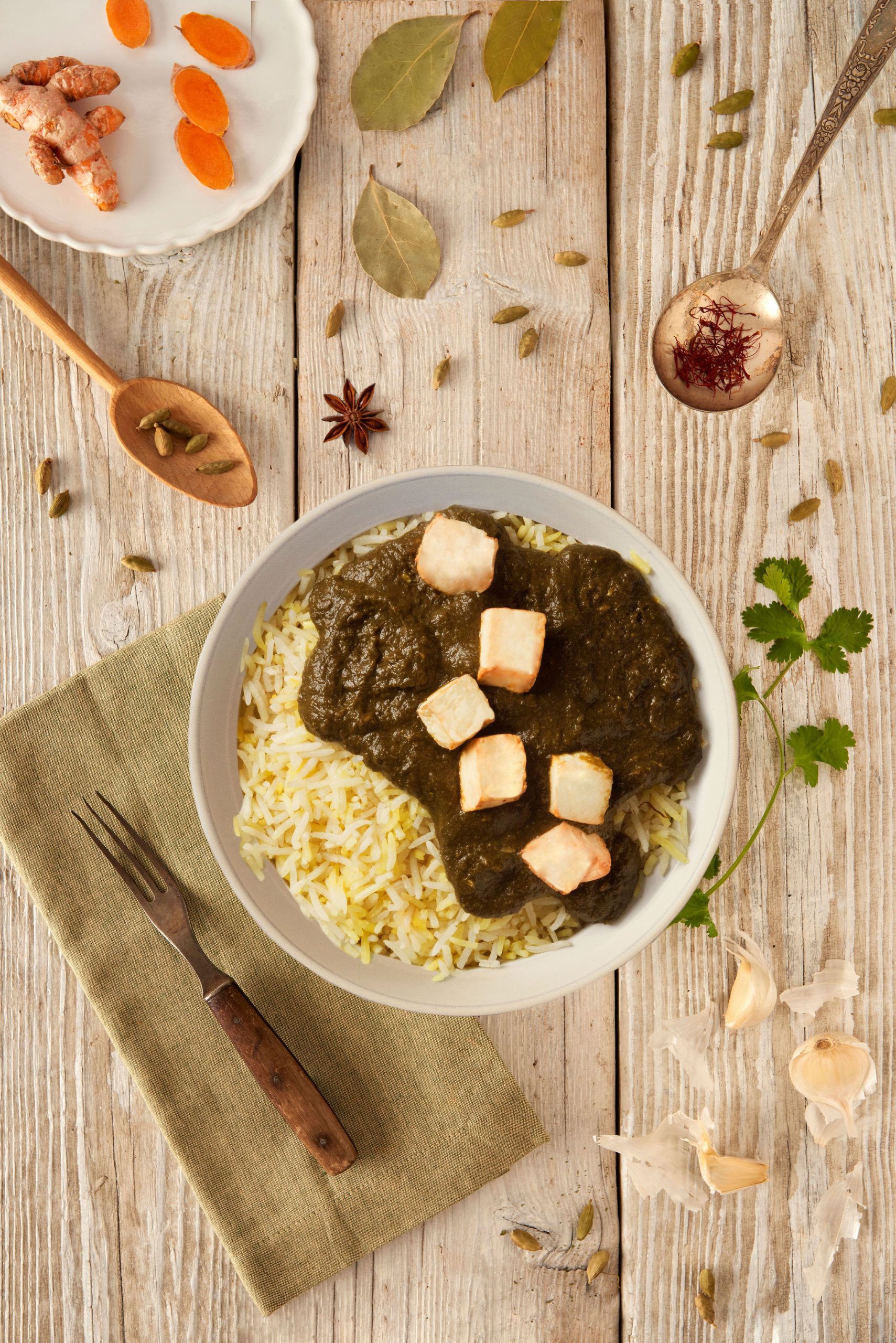 Eat (and enjoy) your greens with our delicious Saag Paneer. We prepare ours with spiced spinach, tomatoes, and onions that are slowly cooked together. The sauce is then topped with cubes of paneer, a traditional Indian farmer-style cheese. We pair this Chef-crafted dish with Basmati rice that’s delicately infused with saffron threads, cardamom, and bay leaves.