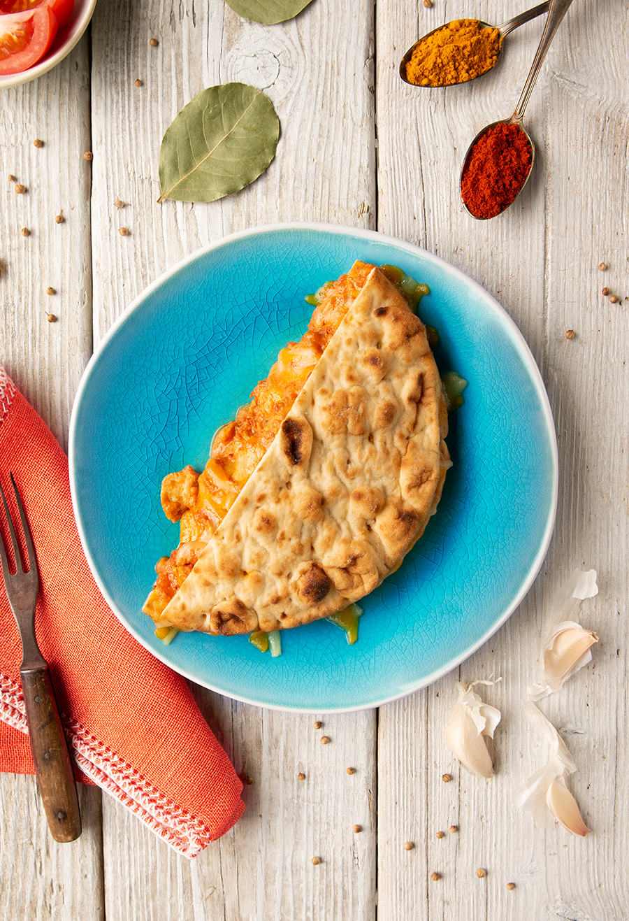 TANDOORI CHICKEN (Chicken (boneless), Low-fat Yogurt (cultured pasteurized milk, skim milk), Lemon Juice, Garlic, Ginger, Spices, Chickpea Flour, Canola Oil, Salt, Paprika), NAAN BREAD (Enriched Wheat Flour (wheat flour, malted barley flour, niacin, reduced iron, thiamin mononitrate, riboflavin, folic acid), Water, Flatbread Base (wheat gluten, modified wheat starch, oat fiber, wheat protein isolate, sunflower oil, whole wheat flour, sea salt, 2% or less of: calcium sulfate, enzymes), Contains Less Than 2% Of: Raw Sugar, Natural Mold Inhibitor (cultured wheat flour, vinegar), Yeast, Sunflower Oil, Sea Salt, Olive Oil, Sodium Bicarbonate, Calcium Sulfate, Ascorbic Acid, Enzymes, Fumaric Acid), TIKKA MASALA SPREAD (Tomatoes (tomatoes, tomato puree, salt), Tomato Puree (tomatoes, citric acid), Heavy Cream, Butter (pasteurized cream, natural flavorings), Spices, Cultured Dextrose, Garlic, Ginger, Sugar, Salt, Turmeric), CHEDDAR JACK CHEESE (Cheddar Cheese (pasteurized milk, cheese culture, salt, enzymes, annatto [color]), Monterey Jack Cheese (pasteurized milk, cheese culture, salt, enzymes), Potato Starch, Corn Starch, Powdered Cellulose [added to prevent caking]))